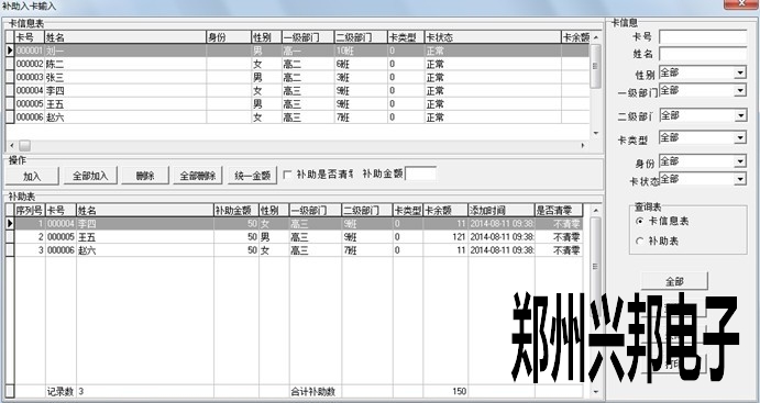 1.485軟件打開后,點(diǎn)一下卡管理--補(bǔ)助入卡--補(bǔ)助入卡輸入,打開補(bǔ)助入卡輸入窗口,在右卡信息中輸入想要添加的人員條件后,點(diǎn)擊下面的查詢,然后在左邊的補(bǔ)助金額后面的框中填寫補(bǔ)助金額,可以選擇是否清零,若選擇補(bǔ)助清零,在領(lǐng)取補(bǔ)助時會將卡上的金額先清零再補(bǔ)助上此次的金額;若選擇不清零,則在領(lǐng)取補(bǔ)助時會累加之前卡上的金額。點(diǎn)擊全部加入,就給選出來的人員生成補(bǔ)助.關(guān)閉此畫面,如下圖所示。